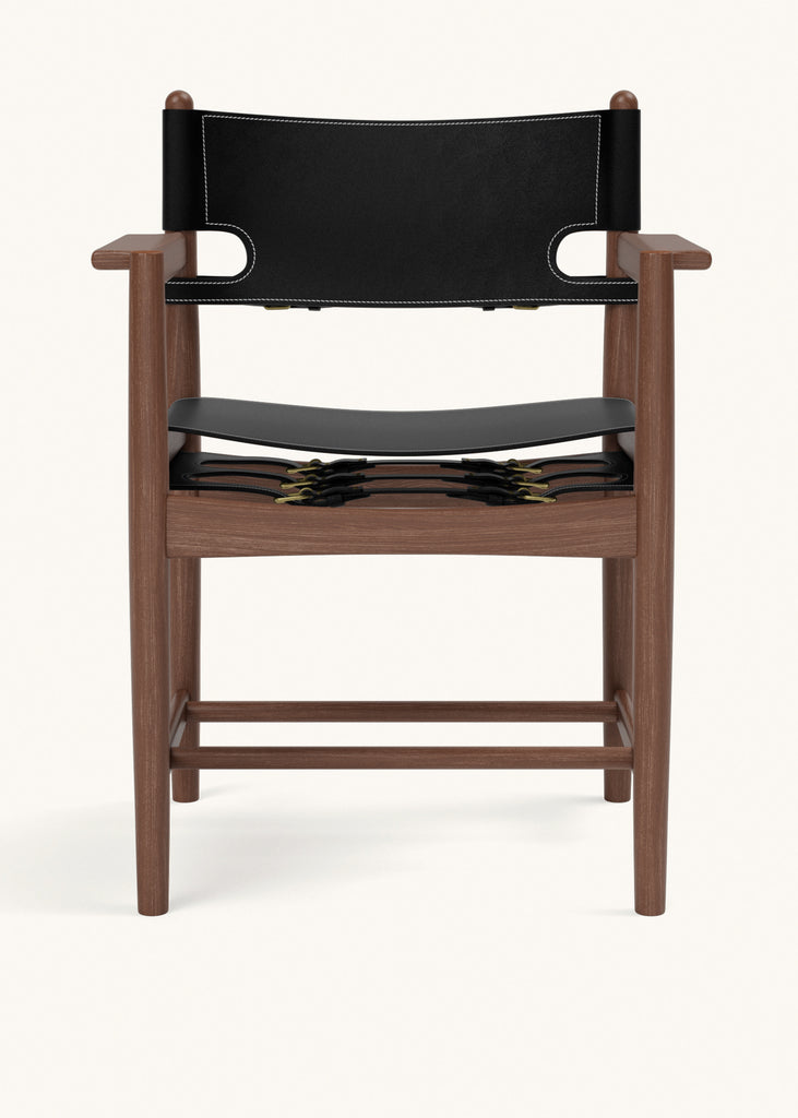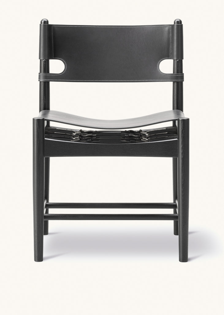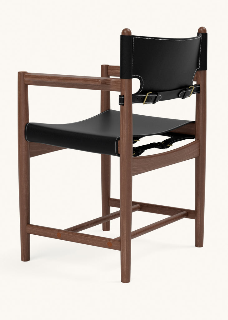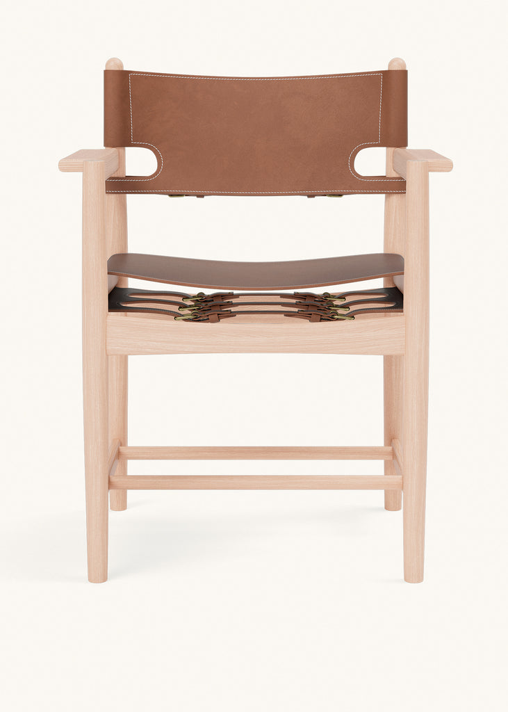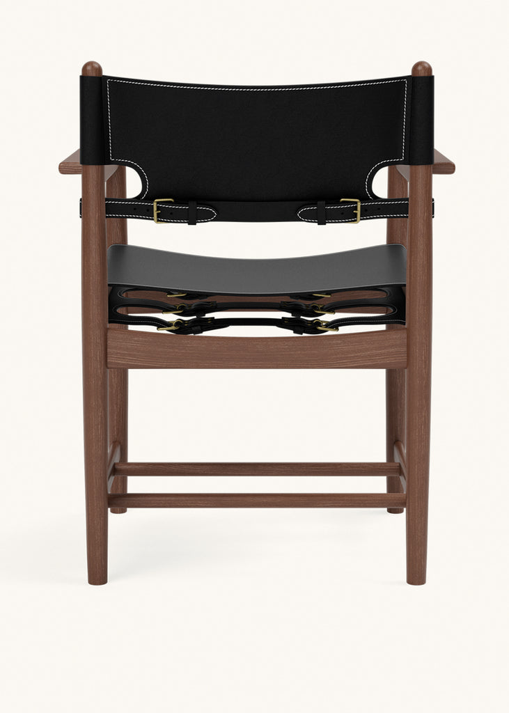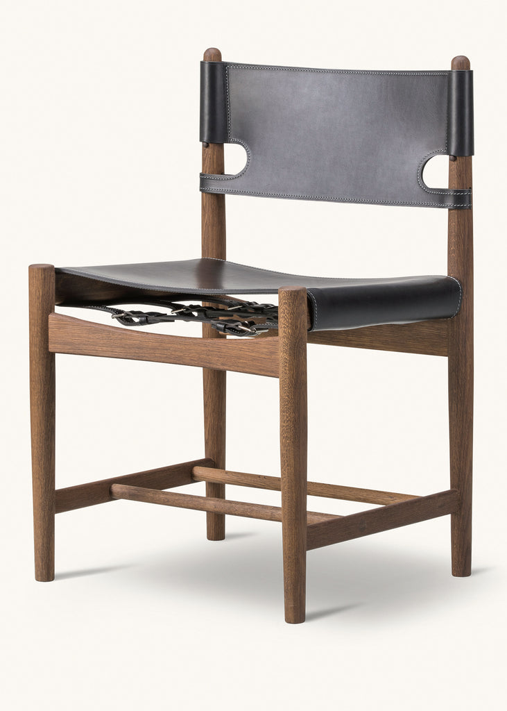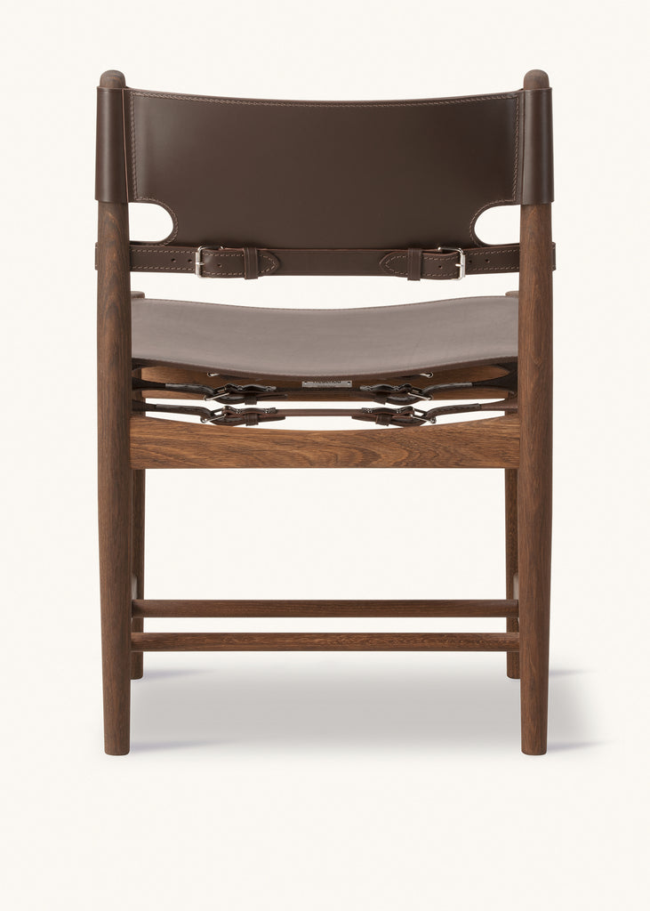 Designed in Denmark by Børge Mogensen in 1958, the Spanish Dining Chair draws inspiration from traditional Spanish furniture-making techniques that used sturdy leather as an integral part of construction. This Spanish approach supported Mogensen's belief that good furniture should be enjoyed now and for generations to come. Available in solid oak or walnut, the chair's high-quality saddle leather develops a patina over time and the adjustable straps can be tightened as the leather naturally expands.