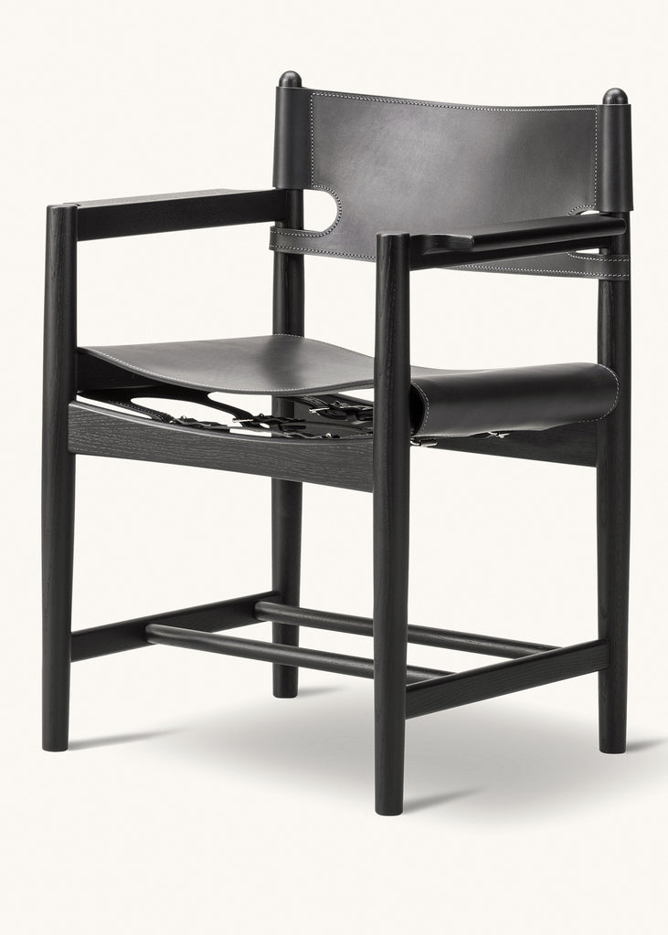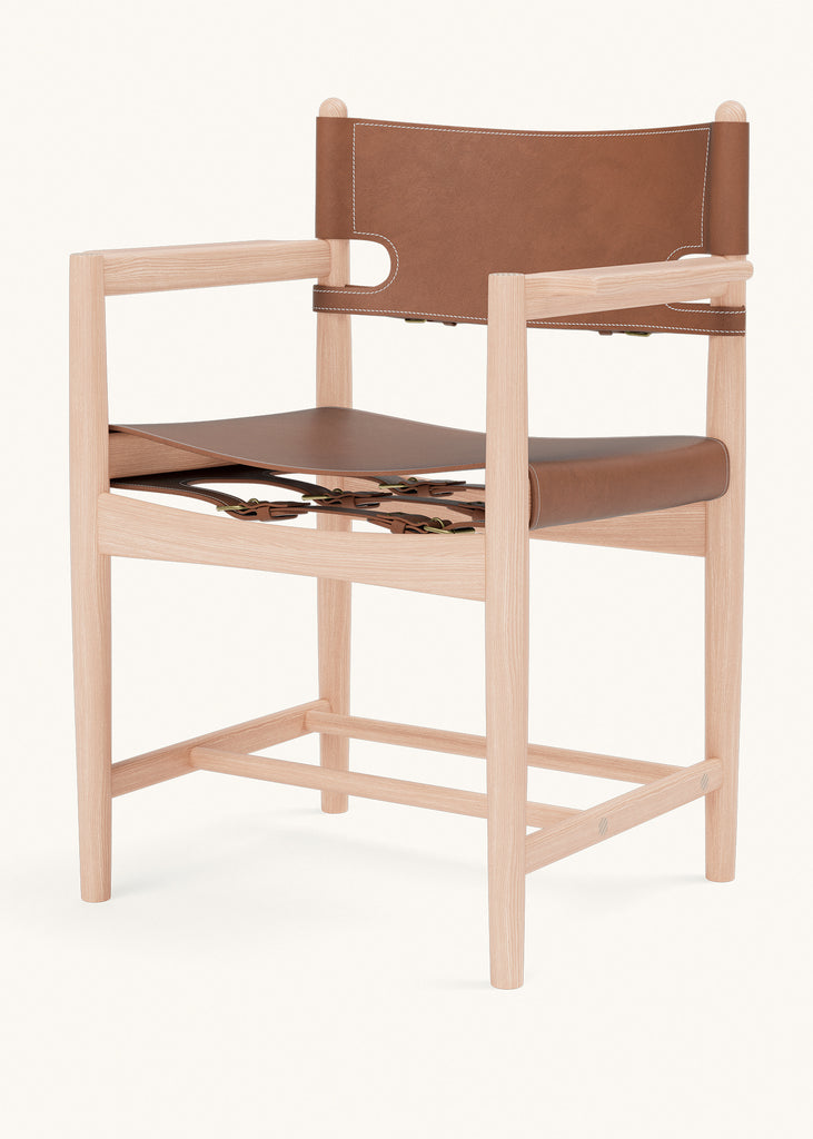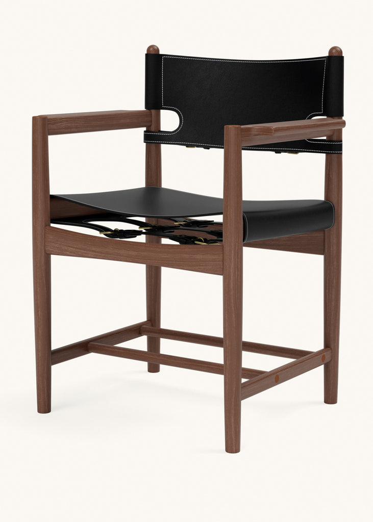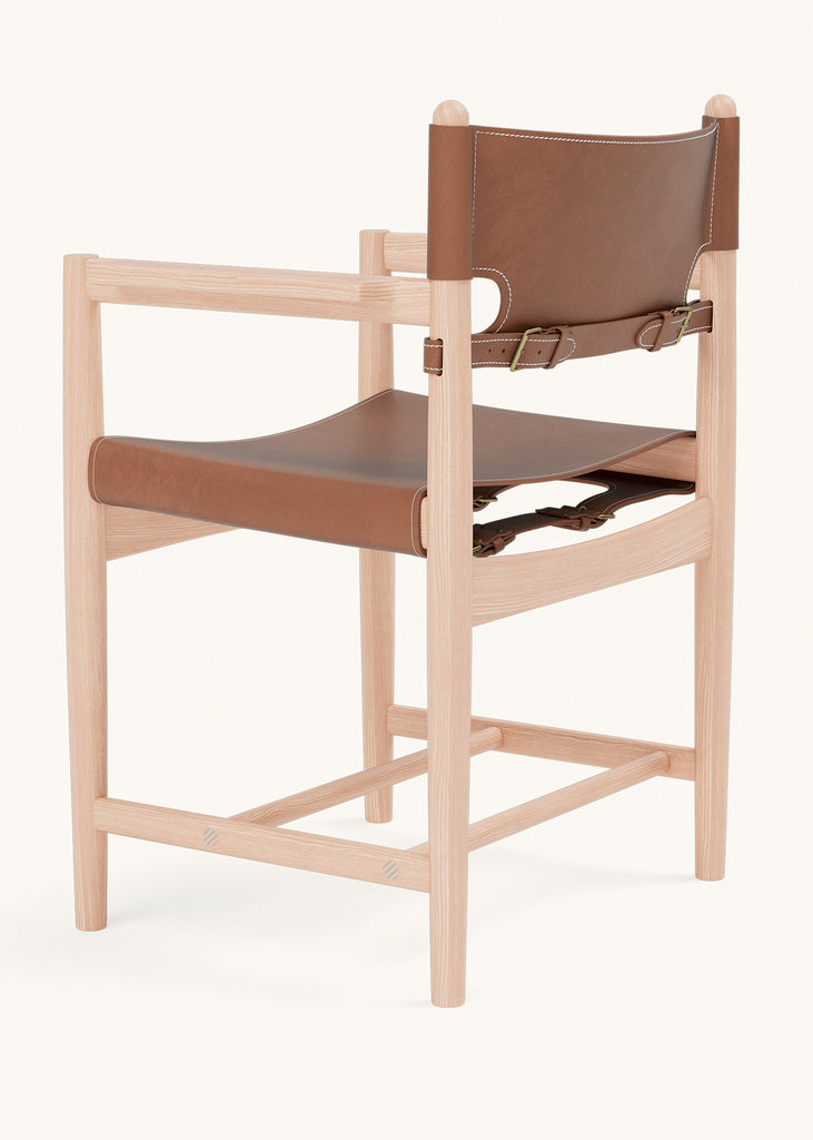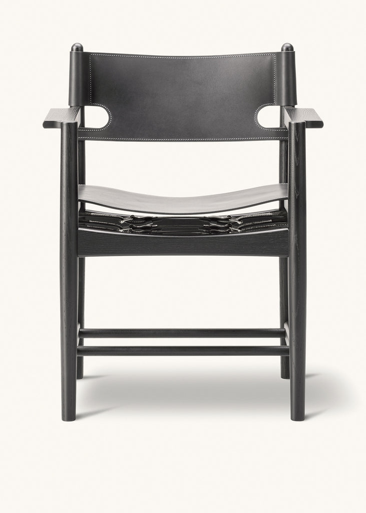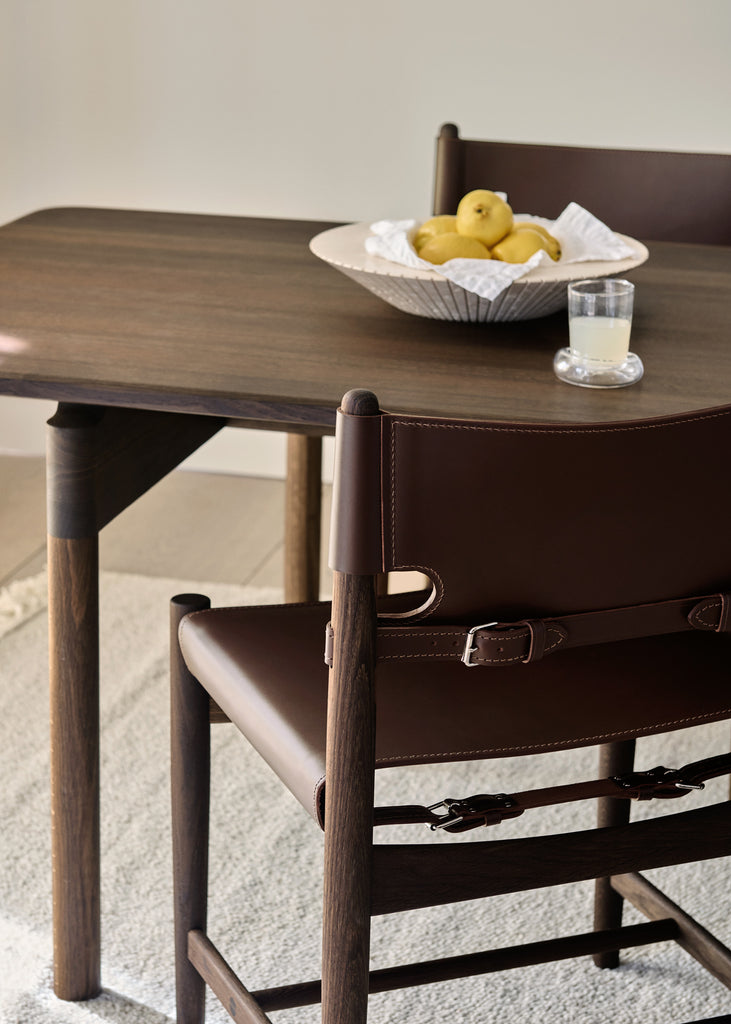 Designed in Denmark by Børge Mogensen in 1958, the Spanish Dining Chair draws inspiration from traditional Spanish furniture-making techniques that used sturdy leather as an integral part of construction. This Spanish approach supported Mogensen's belief that good furniture should be enjoyed now and for generations to come. Available in solid oak or walnut, the chair's high-quality saddle leather develops a patina over time and the adjustable straps can be tightened as the leather naturally expands.